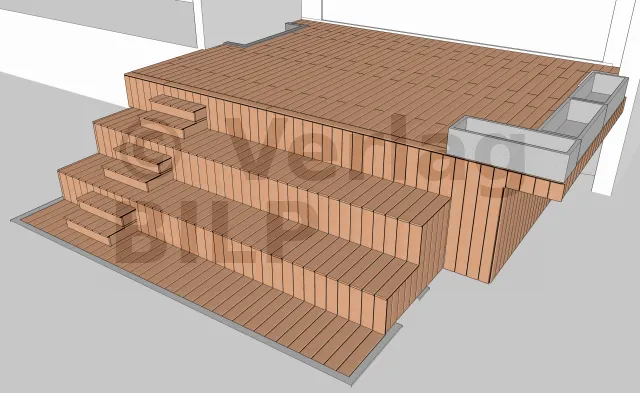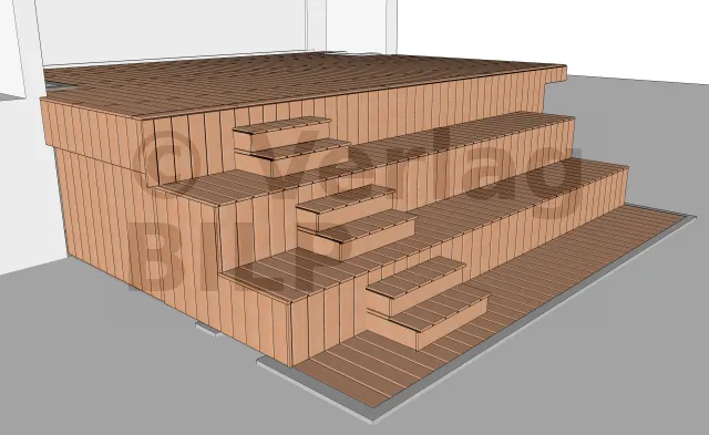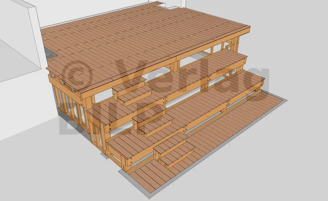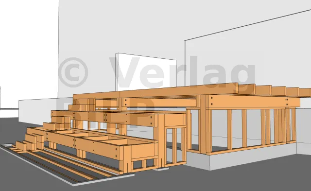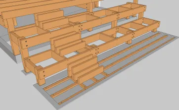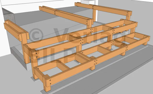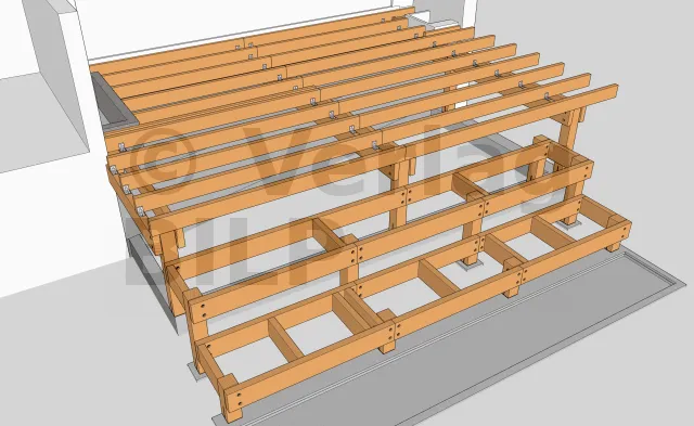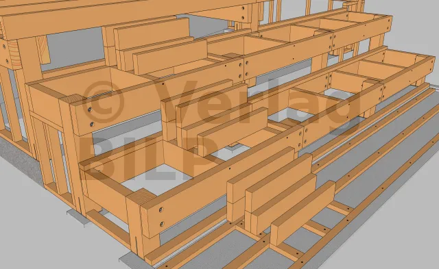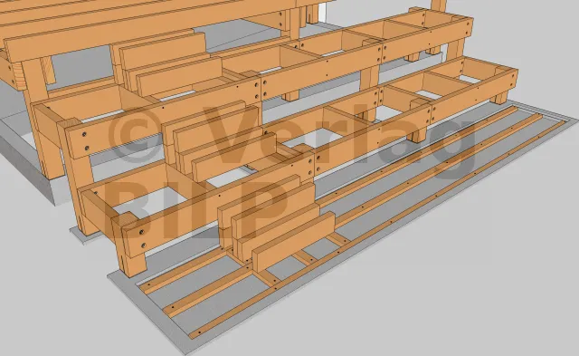 Die Struktur der Stufen von Treppe besteht aus Kanthölzern, deren Querschnitt groß genug ist, um die Umsetzung zu erleichtern.