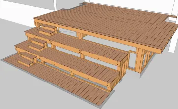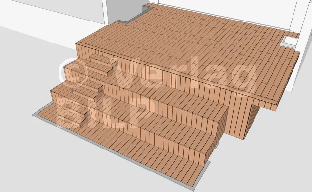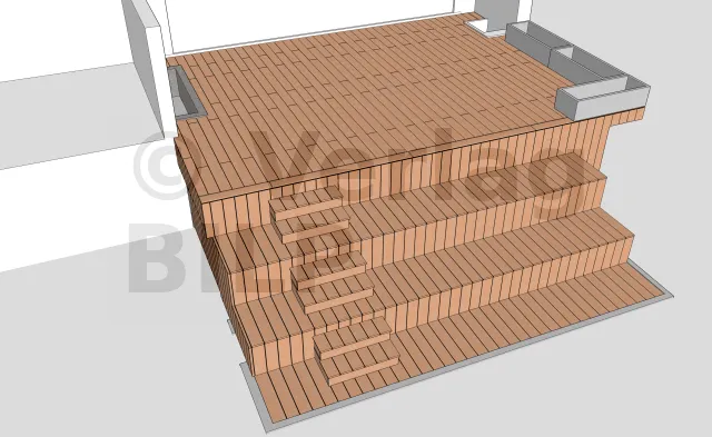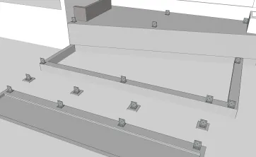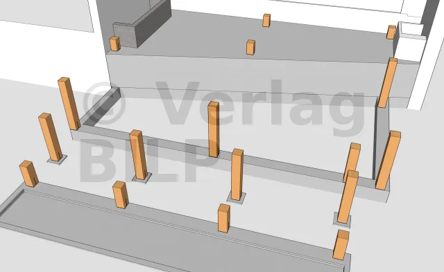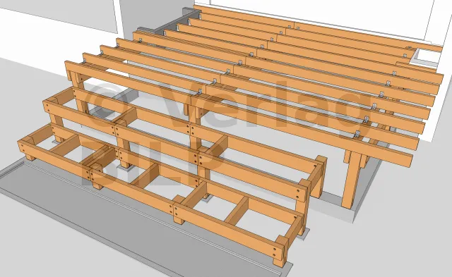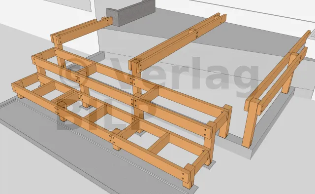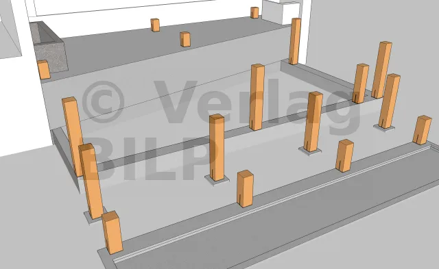 Die Bestimmung der Lage der Betonsockel beruht auf der Bemessung der Elemente der Terrassenkonstruktion, insbesondere dem maximalen Achsabstand zwischen den Stützen, dem Querschnitt und der Spannweite der Balken, der Unterzugbalken und der Pfosten.