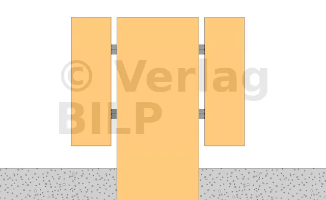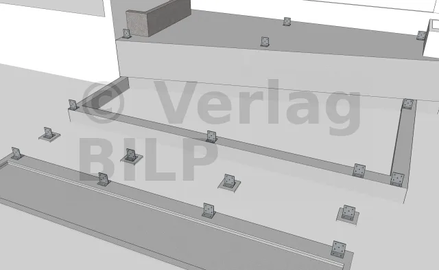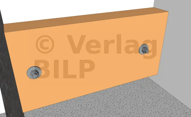 Sie können mit Betonankerschrauben Typ MULTI-MONTI TimberConnect oder Schlagdübel an der Platte befestigt werden, jedoch immer mit Kunststoffkeilen oder Holzkeilen.