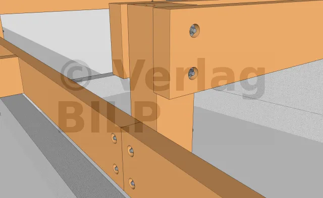 Die Montage der Unterzugbalken auf den Pfosten erfolgt mit Gewindestangen, Muttern und Unterlegscheiben.