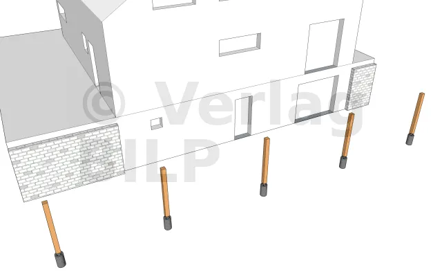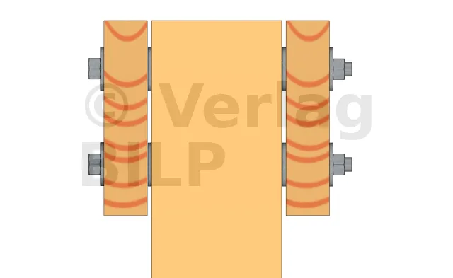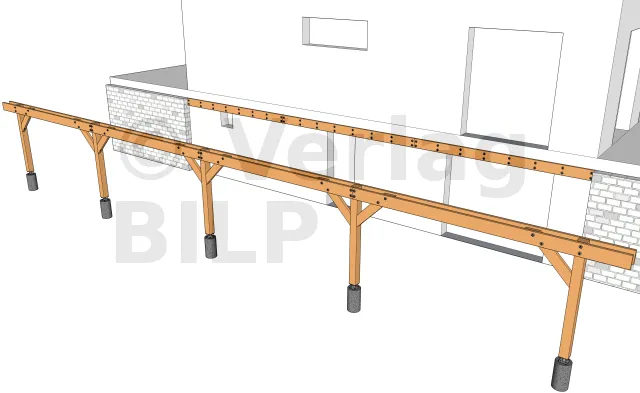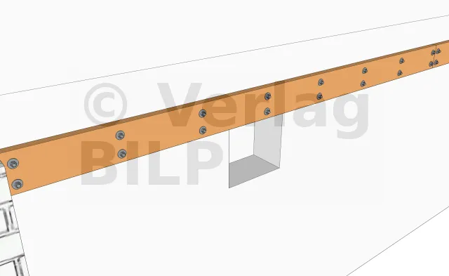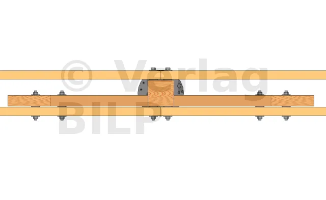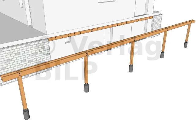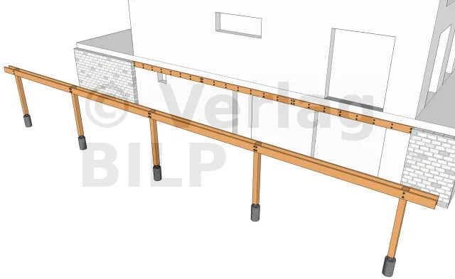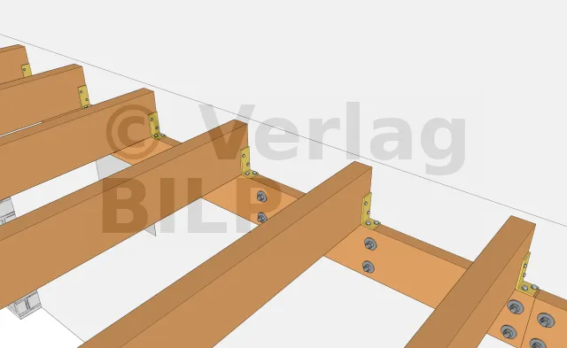 Außerdem muss eine Belüftung geschaffen und eine Stagnation des Wassers zwischen dem Unterzugbalken und der Verstrebung vermieden werden, indem ein kleiner Spalt von 5 bis 10 mm mit hochbelastbaren breiten Keilen, Unterlegscheiben oder Muttern geschaffen wird.