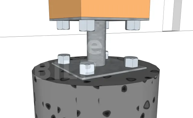 Die Streben werden mit Gewindestangen, Muttern und Unterlegscheiben des Rahmens an den Unterzugbalken befestigt.