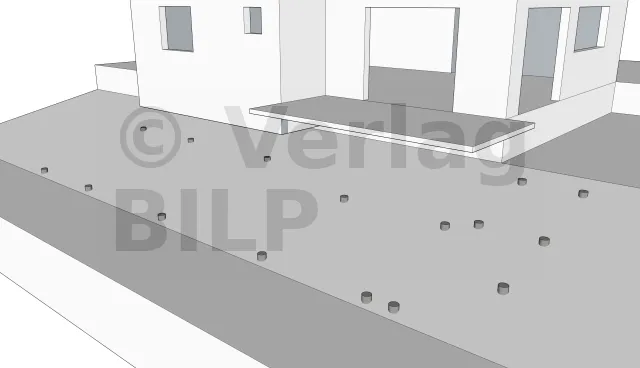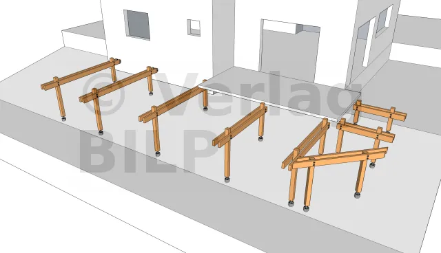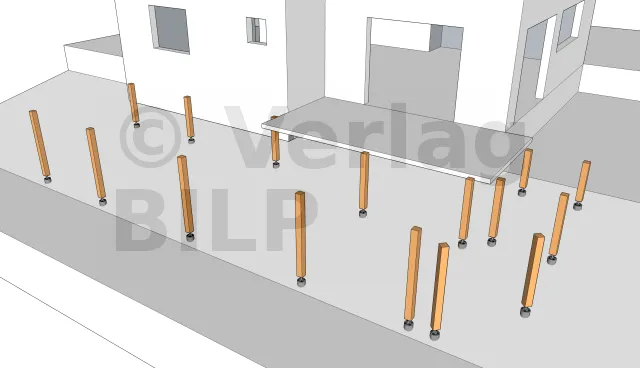Der Einbau der Pfosten muss immer mit den Eckpfosten beginnen, da diese als Widerlager für die Unterzugbalken und als Stützen an den Enden dienen.