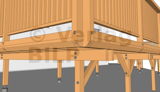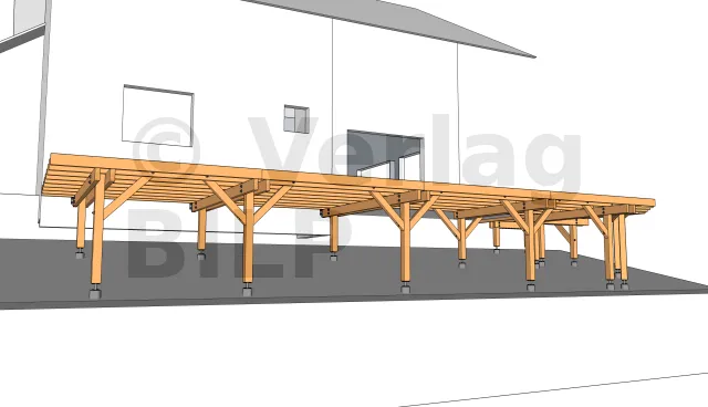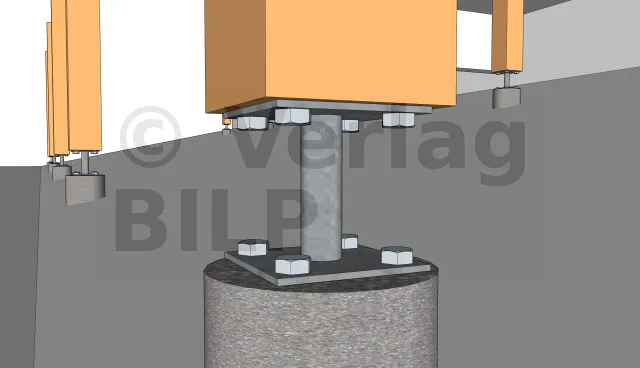 Die Stützen werden auf den Betonfundamenten durch Stützenfüße befestigt. Für diesen speziellen Fall haben wir feste Stützenfüße gewählt. Sie werden mit Sechskant-Holzschraube an der Stützen und mit Ankerdübel oder chemische Dichtmasse, Gewindestangen an den Betonfundamenten befestigt, die dann mit Muttern und Unterlegscheiben angezogen werden.