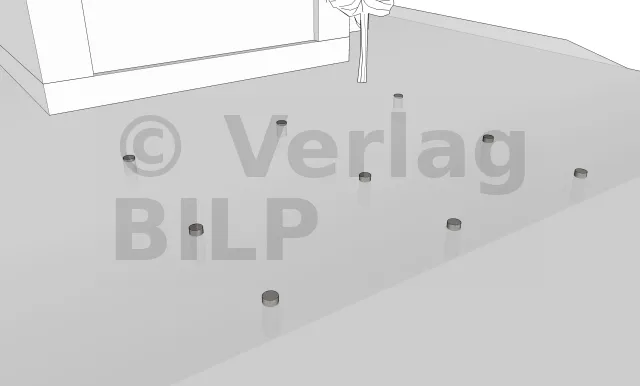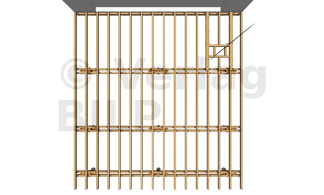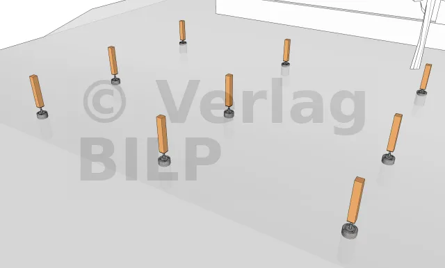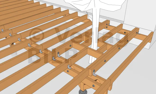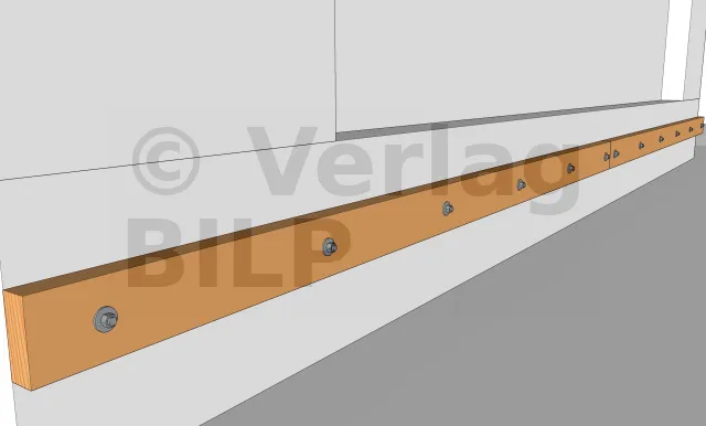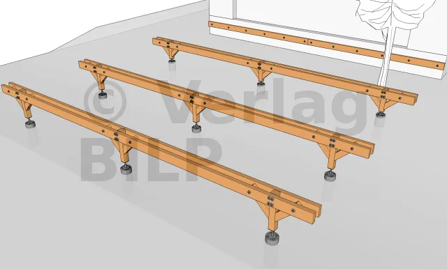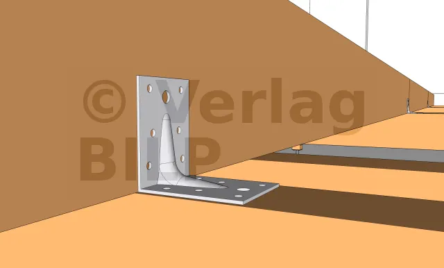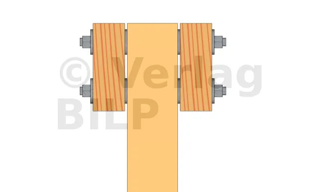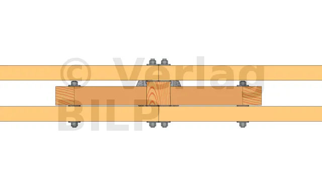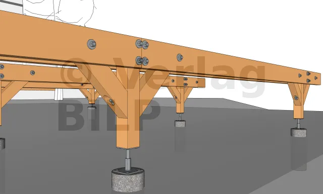 Wie bei der Stütze und den Unterzugbalken ist es auch hier notwendig, eine Belüftung zu schaffen und eine Stagnation des Wassers zwischen dem Unterzugbalken und der Aussteifung zu verhindern, indem ein kleiner Spalt von 5 bis 10 mm mit hochbelastbaren breiten Unterlegkeilen, Unterlegscheiben oder Muttern geschaffen wird.