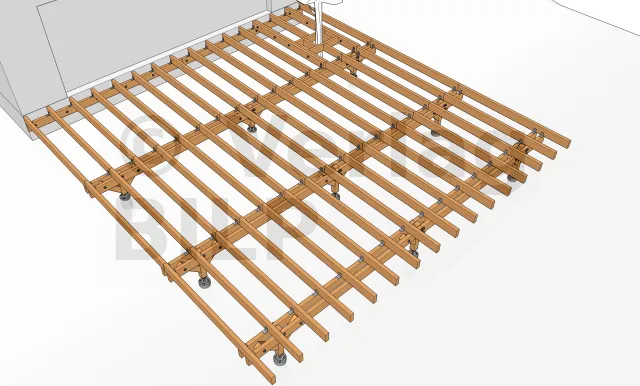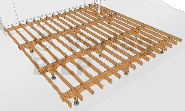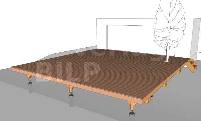 Ihre Lage wird durch Bemessung der verschiedenen Elemente der Terrassenstruktur wie maximaler Achsabstand zwischen den Stützen, Querschnitt und Spannweite der Balken, der Unterzugbalken und der Pfosten ermittelt.