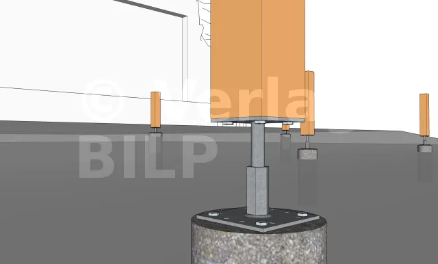 Die Befestigung kann entweder mit chemischer Abdichtung der Gewindestangen erfolgen, die mit Muttern und Unterlegscheiben oder mit MULTI-MONTI TimberConnect Ankerschrauben angezogen werden.