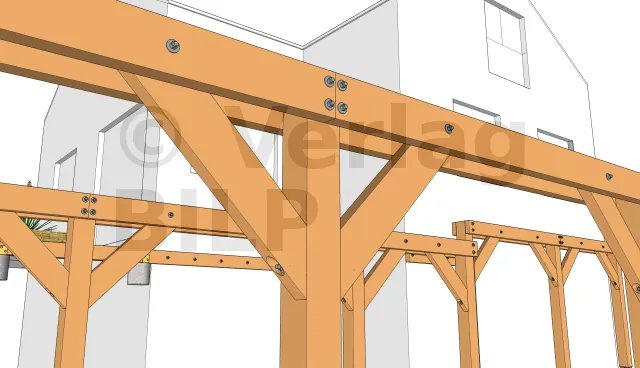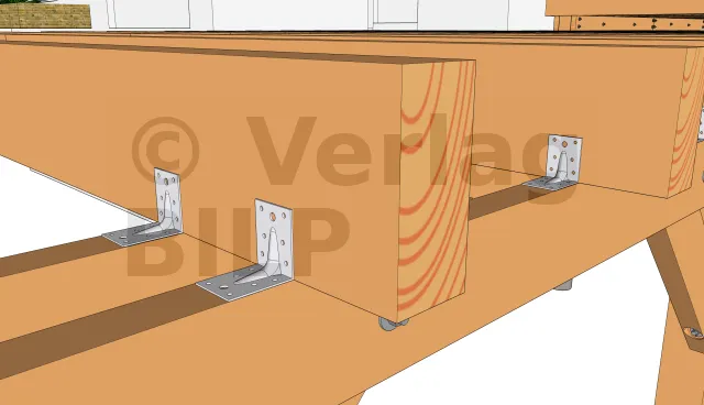 Die Befestigung kann mit Winkelverbinder wie z.B. verstärkte Winkelverbinder oder einfache Winkelverbinder erfolgen, die mit Rillennägel oder Verbindungsschrauben befestigt werden. Eine weitere ebenso effektive Lösung ist die Befestigung von oben mit CombiConnect-Schrauben.