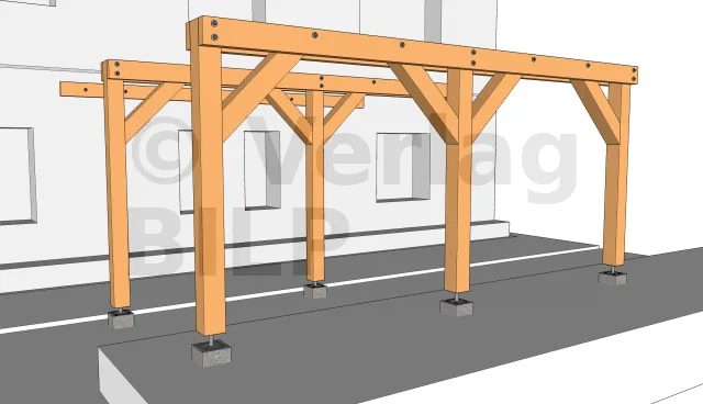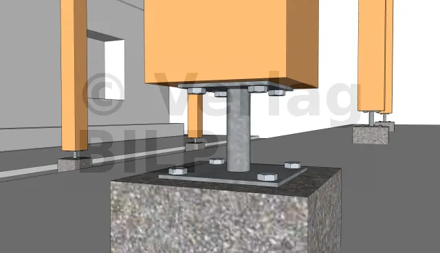 Die Befestigung der Ständer an den Fundamenten erfolgt mit Stützenfüße. In diesem speziellen Fall haben wir feste Stützenfüsse verwendet. Sie werden mit Sechskant-Holzschrauben an den Ständer und Betonsockel entweder durch Ankerbolzen oder durch chemische Versiegelung der Gewindestangen befestigt und dann mit Muttern und Unterlegscheiben angezogen.