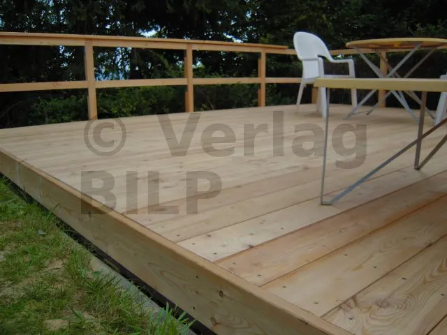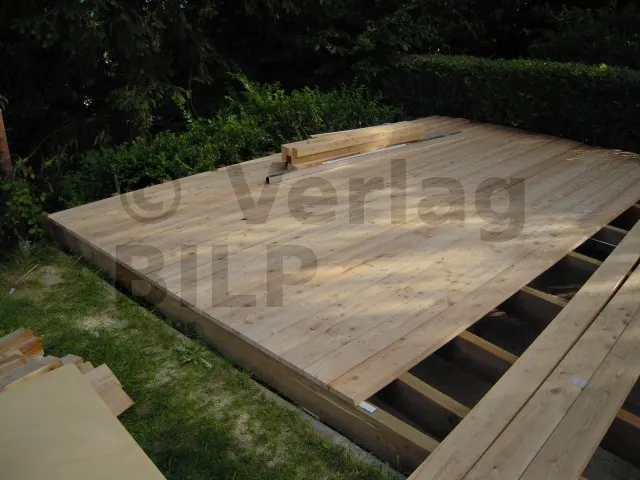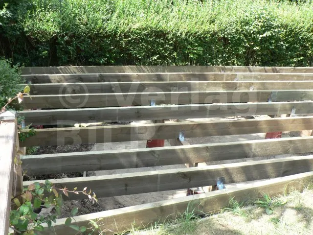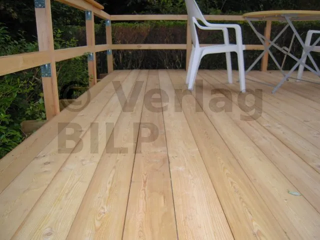 Um einen direkten Kontakt zwischen den Terrassendielen und den Balken zu vermeiden, wurden Kunststoffkeile eingesetzt, bevor die Dielen mit Edelstahlschrauben endgültig befestigt werden.