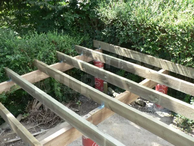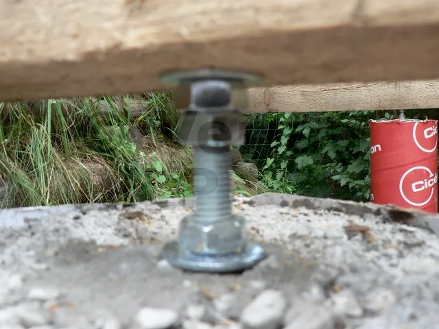Sie können auch Schlagdübel verwenden, indem Sie ein paar PVC-Keile unter die Unterzugbalken legen, Gewindestangen , die mit einer Mutter + Unterlegscheibe in den noch frischen Beton eingeschweißt werden, Metall-Flachverbinder, Winkelverbinder oder MULTI-MONTI TimberConnect-Schrauben, die von oben befestigt werden.