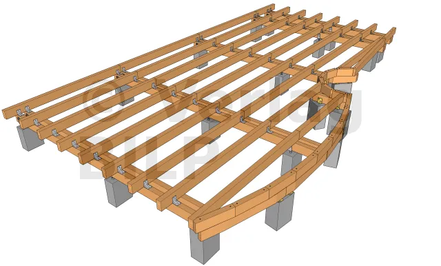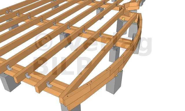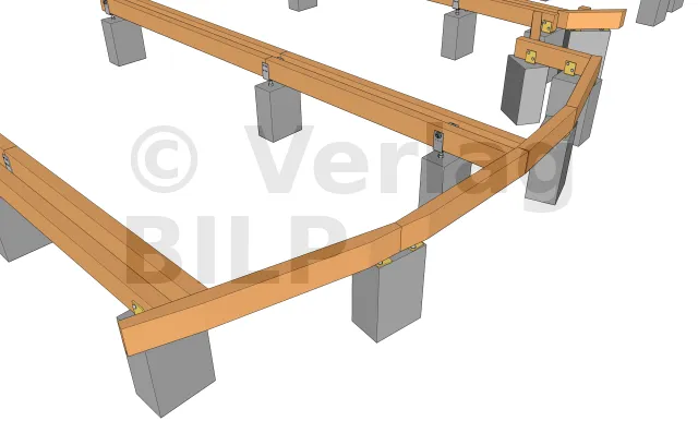 Bei diesem Projekt wurden die vorderen Unterzugbalken für die Kurven mit 3 mm dicken verstärkten Winkelverbinder befestigt. Zu diesem Zweck wird der Winkelverbinder mit Sechskantankerschrauben an den Sockel und mit speziellen Verbindungsschrauben oder einer Sechskant-Holzschraube an den vorderen Unterzugbalken befestigt.