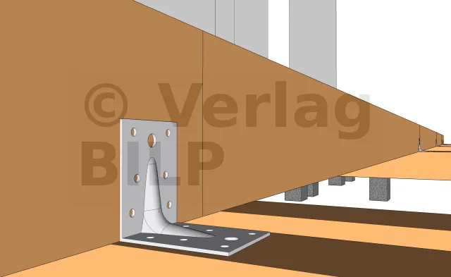 Entweder mit Winkelverbinder wie z.B. verstärkte Winkelverbinder oder einfache Winkelverbinder, die mit Rillennägel oder Verbindungsschrauben befestigt werden.