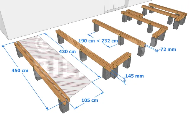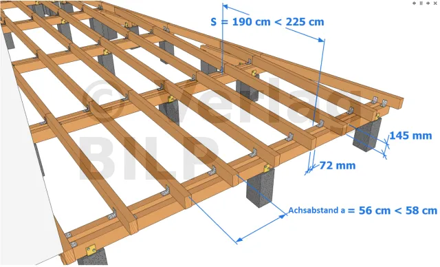 Wir haben die Spannweite s der Balken mit 225 cm festgelegt. Diese Spannweite wurde für den Entwurf der Terrasse verwendet.